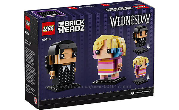 Набір LEGO 40750 був випущений в рамках серії LEGO Brick Headz. Він містить 239 якісних деталей, барвисту інструкцію (є також доступ до електронних інструкцій у застосунку LEGO Building Instructions) і призначений від 10 років. Тематика набору - фільми та серіали.Зачаруйте шанувальників серіалу Wednesday за допомогою набору LEGO® BrickHeadz™ Wednesday & Enid, призначеного для дівчаток та хлопчиків від 10 років. Ці іграшки за мотивами популярного шоу миттєво впізнаються завдяки культовим деталям. Wednesday Addams носить свою знакову чорну сукню, а Enid Sinclair — яскравий джемпер та світле волосся. Після складання моделі стають відмінними виставковими експонатами, дозволяючи серіалу продовжувати приносити радість навіть після перегляду.