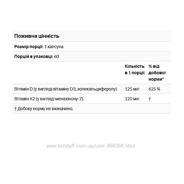 Вітаміни D3 та K2 відіграють важливу роль для організму та загального здоров’я. Вітамін D3 допомагає організму засвоювати кальцій і фосфор, що є важливими для формування та підтримки міцних кісток*. Крім того, вітамін K2 може забезпечити додаткову підтримку для розвитку міцних кісток, а також підтримати серцево-судинну систему, оскільки потенційно сприяє здоровому згортанню крові.