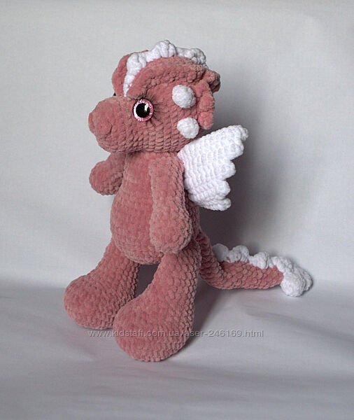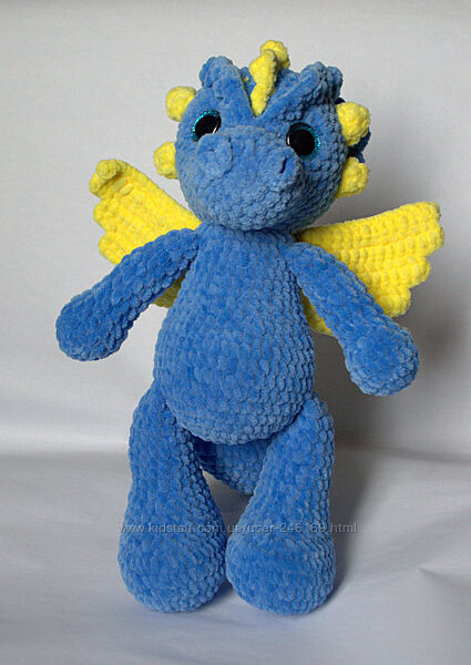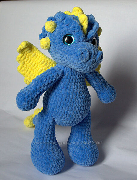 Затишна та приємна на дотик м´яка іграшка ручної роботи - плюшевий Дракон. Наповнювач - холофайбер (новий). Ціна вказана за одиницю. Використання беспечних очей дозволяє гратися малечі, можна і як інтер´єрна іграшка.Розмір вказан з хвостом та без нього.