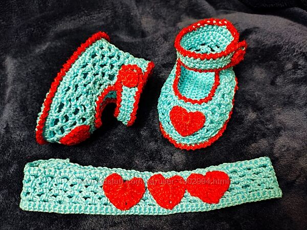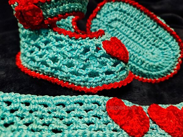 Чудовий оригінальний подарунок для дівчинки крихітки, з любов’ю в кожній петелечці.Ніжні милі ажурні нарядні м’якенькі гарненькі пінетки і пов’язка (із пряжі YarnArt Begonia, 100% бавовна) для маленької красотульки. Блакитного кольору з червоними сердечками.