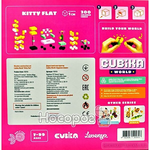 Продам деревянный конструктор Cubika World Африка и дом кошки.1. Деревянный конструктор Cubika World Африка. Набор состоит из 200 разноцветных деревянных кубиков, ленты, на которой размещены двусторонние клейкие кружочки (скотч) и инструкция по сбору конструктора. Каждый цвет квадратов находится в отдельном пакетике.С помощью скотча необходимо соединить последовательно элементы согласно инструкции.В результате чего должны выйти фигуры: лев, львенок, жираф, крокодил, дерево. После склеивания деталей фигурки держатся крепко и их можно использовать в различных играх. В игрушке используются только самые качественные образцы тополя и бука, которые растут в экологически чистом районе Карпат,а при окраске используется краска на водной основе, абсолютно безопасная для детей. Возрастная категория 7-99 лет.Цена: 300 грн.