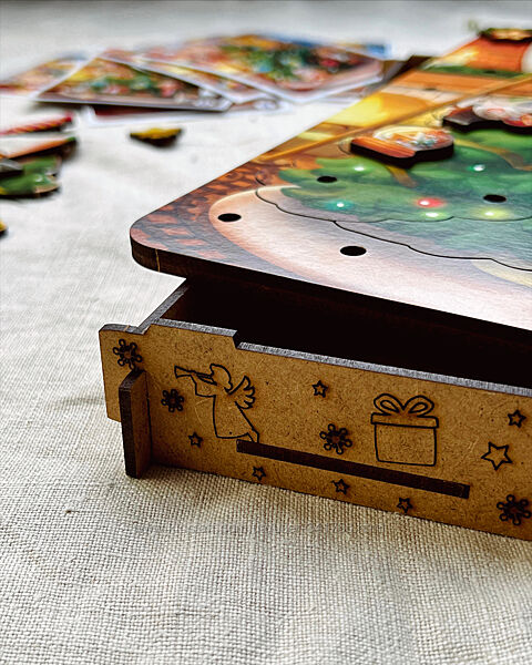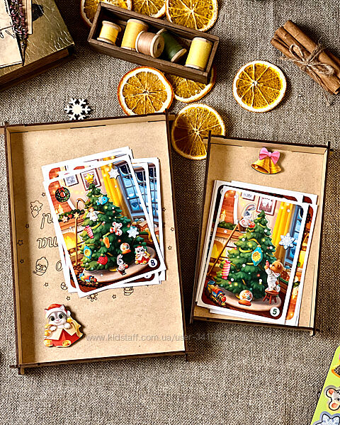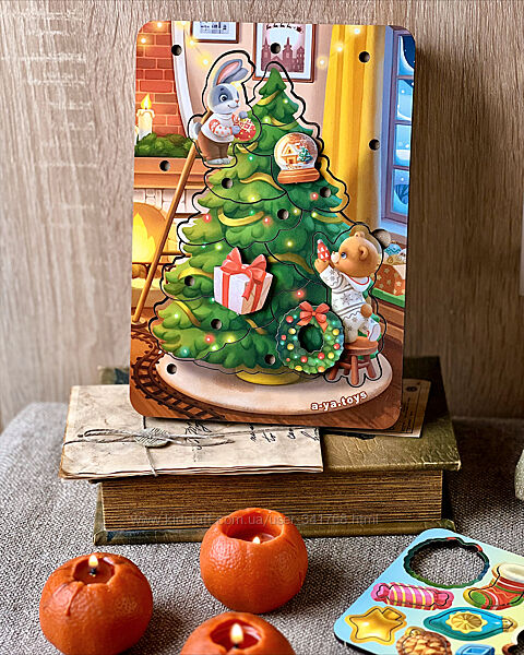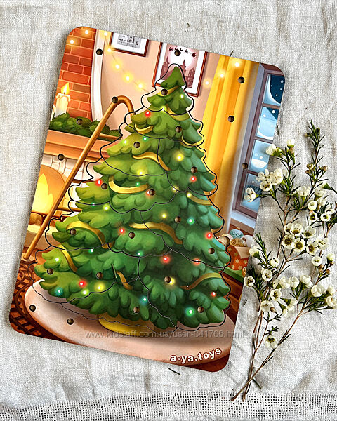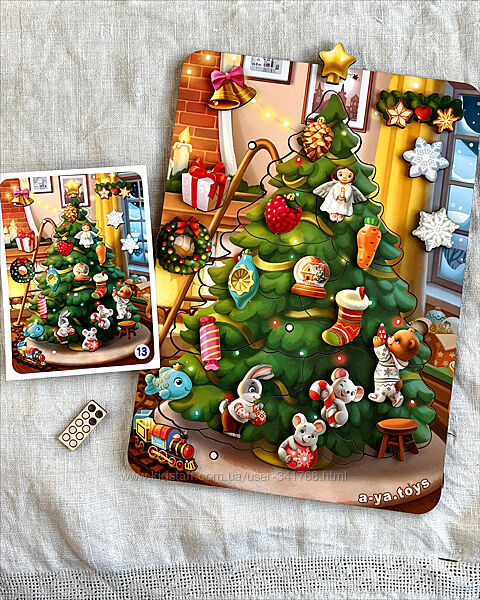 У наборі: ялинка з 12 деталей, 12 іграшок та 16 карток.