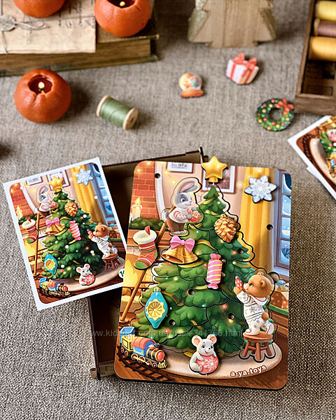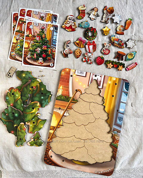 У наборі: ялинка з 10 деталей, 23 іграшки та 16 карток.