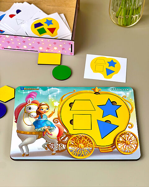Розвиваюча гра 2 в 1 для хлопчиків у вигляді Трактора і для дівчаток у вигляді Карети.Кузов трактора і карети - це змінні основи 5-ти кольорів. Малюкові необхідно вставити різнокольорові геометричні фігури в основу як вказано на картках.