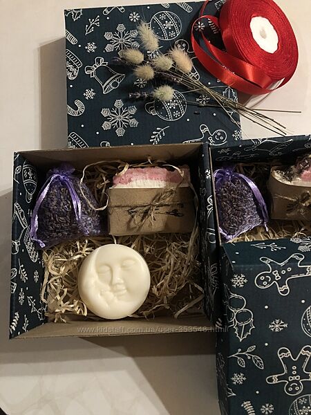 Можна скласти подарунковий бокс, додамо натуральне мило ручної роботи, м‘якенькі шкарпетки(в асортименті), сіль для ванни та букетик лаванди