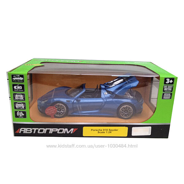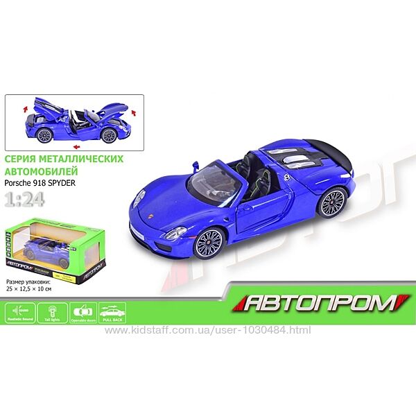Машина метал. "АВТОПРОМ" М1:24 Porsche 918 Spyder, бат, світло, звук, відк. дв, капот, багажникРозмір коробки 25*12*10 см.