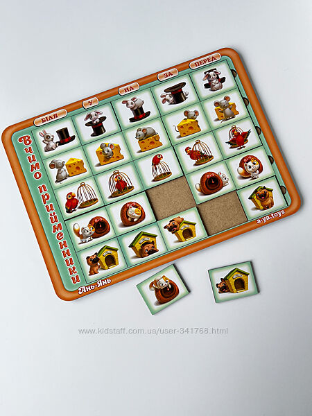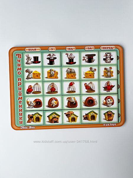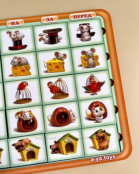Сортер складається з планшета, на якому зображено 25 квадратних плашок з різними персонажами, що візуально демонструють значення п’яти прийменників: "біля", "у", "на", "за" та "перед".Тепер вивчати прийменники стане цікавіше. Плашки також можна рахувати та грати в "Меморі" і "5-й зайвий".