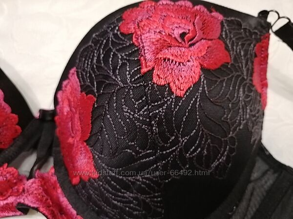 Эффектный бюстгальтер Ann Summers 85 Е, 38 DD.Соответствует размеру. Новый, с биркой. Не сток. 60 % полиэстер, 30% полиамид, 10% эластан. Чашки на поролоне. Красивая красная вышивка гладью на черном фоне.