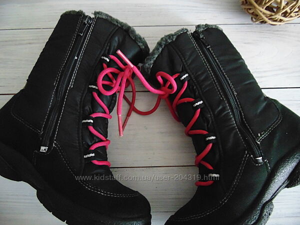 ** Всередині - утеплювач 100% поліестер / Gore-Tex мембрана GORE-TEX - це ідеальний матеріал для дитячого взуття. Розташований між матеріалом верху і підкладкою, він надає взуття чудові властивості: діти можуть безтурботно стрибати по калюжах, ходити по високому снігу або під дощем. Ноги залишаються сухими, і у взутті зберігається оптимальний мікроклімат. Матеріал GORE-TEX водо- і вітронепроникної, але він пропускає водяну пару (вологу тіла) назовні, тому він вважається дихаючим.