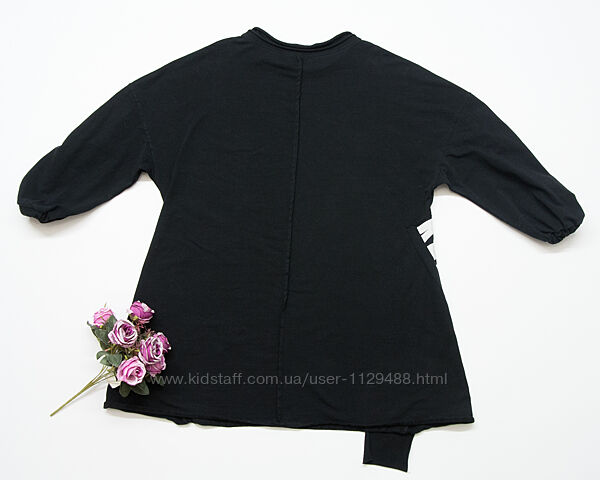 Необычная, акцентная, комфортная. Свободного расслабленного кроя, удлиненная, с асимметичными элементами, декорирована крупным контрастным текстовым принтом. Линия плеча сильно спущена, рукава объемные, укороченные, оформлены складками, по низу резинка. Вещь универсальная, легко вписывается в гардероб и сочетается с любым низом. Выполнена из плотного мягкого эластичного трикотажа.