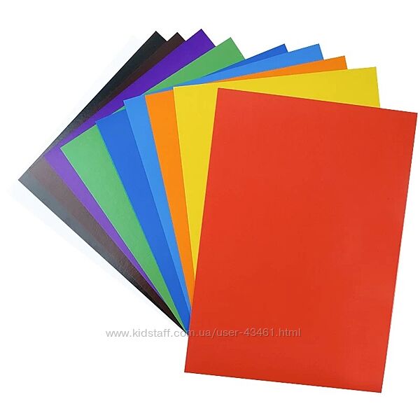Набір яскравий та якісний: складається з 10 аркушів гармонійної палітри червоного, помаранчевого, жовтого, зеленого, блакитного, синього, фіолетового, коричневого, чорного, та білого кольорів.