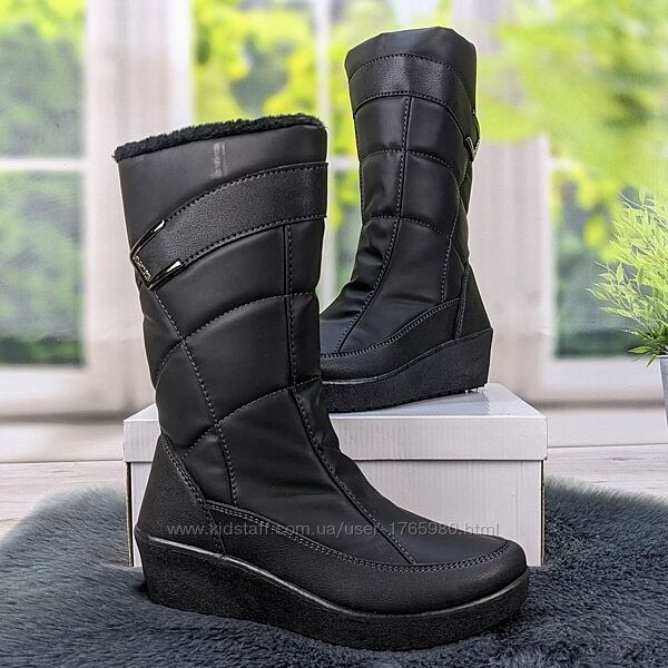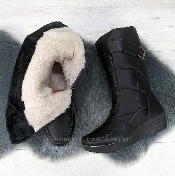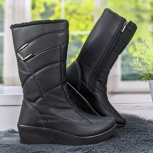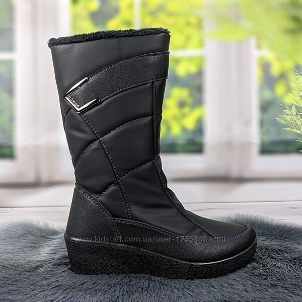 Сапоги женские зимние эко-кожа Paolla черные 4353Женские сапоги украинской фабрики Paolla являются отличной бюджетной, практичной обувью для осенне зимнего сезона. Смотрятся стильно и аккуратно.Верх - эко-кожа. Высота от подошвы 26 смПодошва ПВХ. Высота подошвы 2-4,5 смПодкладка - искусственный мехАкуратная модель на танкетке. Подойдет на ногу средней полноты, не широкую. Обхват голенища от 34,5 см до 38,5 см (в зависимости от размера)