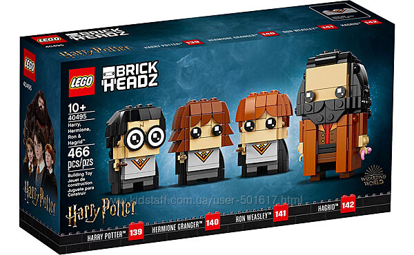 LEGO BrickHeadz відтворює 4 найвідоміших персонажів з фільмів про Гаррі Поттера:Гаррі Поттер, Герміону Грейнджер, Рон Уїзлі, Рубеус Гегрід.