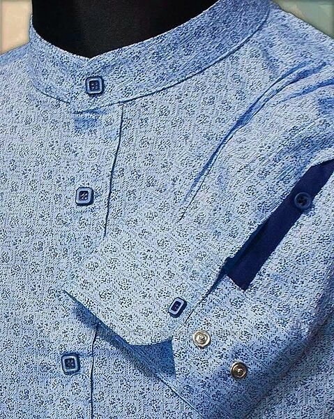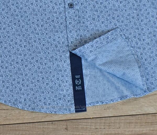 Турецька чоловіча сорочка Black Stone блакитного кольору з стильним візерунком, застібається на кнопках. Тканина тягнеться, приємна до тіла, по складу 95% бавовна і 5% лайкра. Заді на лівому плечі, є невеликий вишитий напис. Є запасна кнопка. Сорочка якісна, в живу виглядає краще ніж на фото, нова, з біркоюРозмір: L.