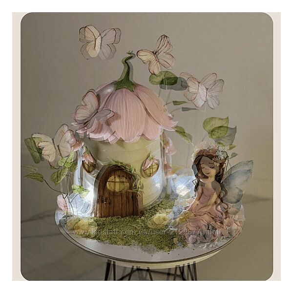 Торт «Домик Феи». Создание декора торта в виде гриба с элементами из сахарной пасты. Изготовление вафельных листиков, бабочек и карамельных шаров с подсветкой. Лепка Феи, сахарных грибов и цветов
