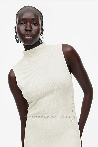 Приталена сукня довжиною до ікри без рукавів з м´якого ребристого трикотажу з невеликим коміром-стійкою та декоративними мереживними вставками з боків.