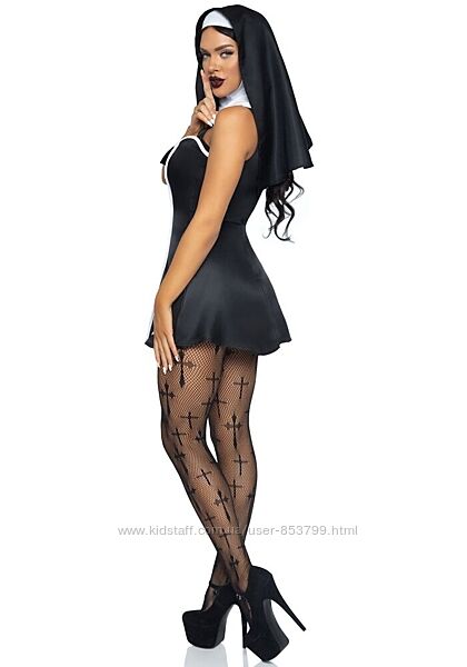Костюм черниці Leg Avenue Naughty Nun, виконаний у чорно-білому кольорі. Сукня має цікавий крій, вишукано підкреслює груди та талію завдяки білій облямівці, а на грудях видно білий хрест. Головний убір являє собою чорно-білу хустку з вирізом для обличчя, що спадає на плечі, рівномірно прикриває зону шиї та спини по лопатки.Костюм черниці Leg Avenue Naughty Nun — це: