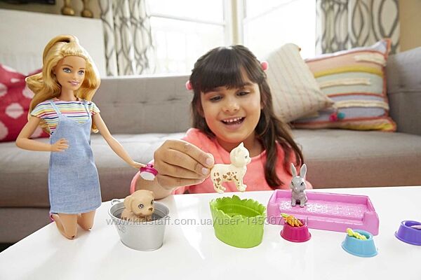 Игровой набор включает куклу Барби в стильной одежде и обуви, трех питомцев с опцией изменения цвета: щенка, котенка и кролика, зеленое ведерко, серебристое ведерко, щеточку, три емкости для еды, пучок морковки, рыбку, косточку и кроватку для питомцев.
