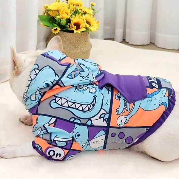 Крутезний яскравий теплий дінохуді! 100% бавовна, дуже щільна, на флісі. З внутрішньої сторони м´якенька, дуже приємна на дотик плюшева підкладка. Манжети на рукавчиках і навколо талії на резинці. Капюшон фіксується на кнопочку. Підійде для французского бульдога, мопса. Сезон - весна, осінь, зима