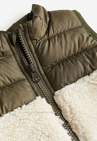 Жилетка від H&M з різними кольоровими ділянками, верхня частина якої виконана з якісного стьобаного плетеного матеріалу, а нижня - з м´якого тедді. Модель має комір-стійку, блискавку з захистом підборіддя для запобігання роздратування шкіри та еластичну обробку в районі пройм і внизу. РІСТ 86 ( спина 34 ПОГ 32 см )92 ( спина 36 ПОГ 33 см )98 ( спина 38 ПОГ 34 см )104 ( спина 40 ПОГ 35 см )СКЛАД- 100% поліестер