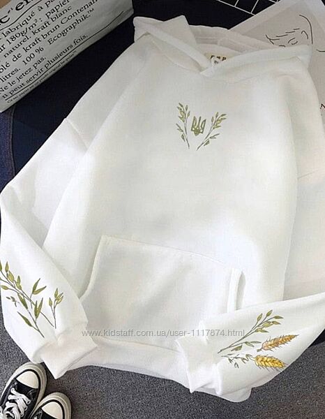 В наявності три універсальні кольори: витончений беж, завжди актуальний білий та насичений чорний, кожен з яких підкреслює унікальний патріотичний принт. Малюнок на грудях і рукавах не тільки прикрашає худі, а й несе в собі глибокий зміст, висловлюючи почуття гордості та приналежності.