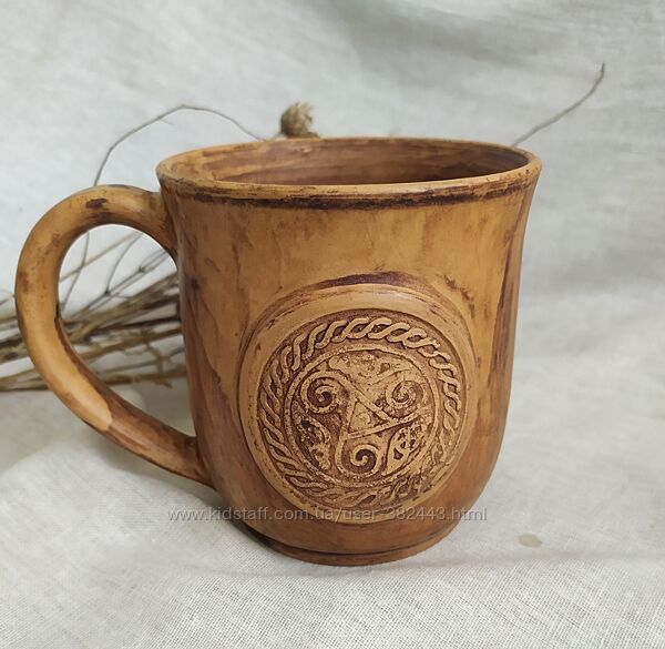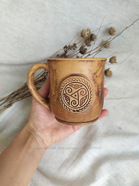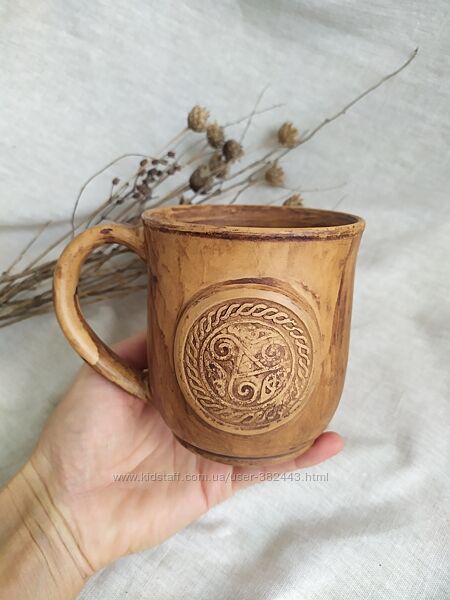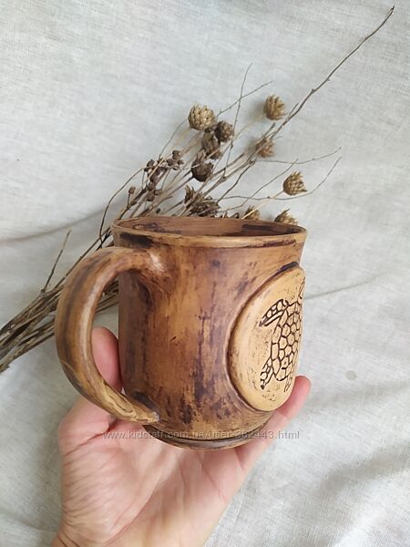Керамічна чашка ручної роботи, зроблена на гончарному колі. Пройшла два випали. Молочена (купана у молоці) та лощена( оброблена по сирій глині).Ємність 350-400 мл.