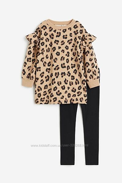 Комплект, що складається зі світшоти з легкої світшотної тканини з малюнком і легінсів з м´якого бавовняного трикотажу. Світшот має круглий виріз з манжетом в рубчик і злегка спущені плечі з воланом. Легінси мають прикритий еластичний пояс.В наявності розмір 5-6 років(116)