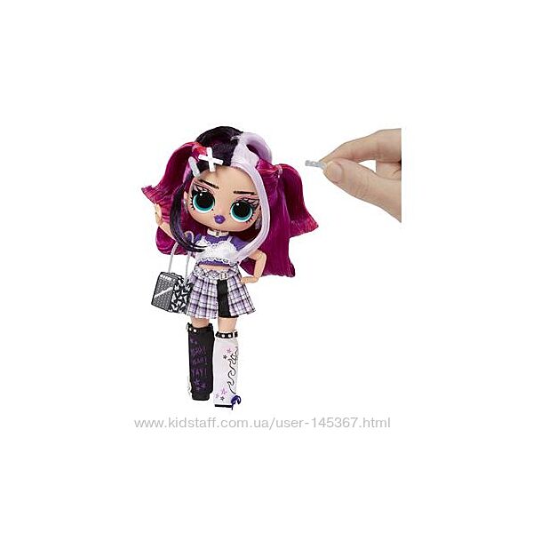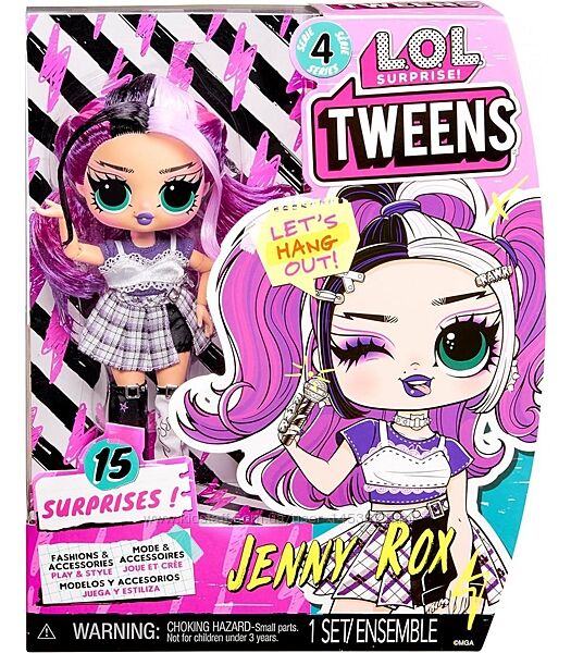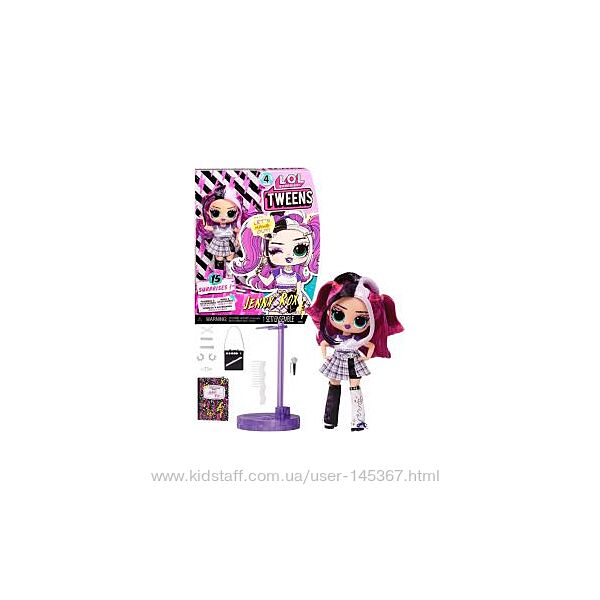 Розпакуйте 15 сюрпризів! Дженні Рокс підносить 15 сюрпризів, у неї приголомшливі риси обличчя, гарне волосся, власний приголомшливий стиль і безліч можливостей для позування. У кожну коробку входить модна лялька LOL Surprise Tweens, крутий модний одяг, взуття, аксесуари, шпильки для волосся, сережки, сумочка, мікрофон, гребінець та підставка для ляльки.