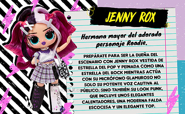 Представляємо модну ляльку LOL Surprise Tweens Дженні Рокс, старшу сестру обожнюваного персонажа! Приготуйтеся підкорити сцену разом із Дженні Рокс у її вбранні попзірки та зачіски, виступаючи з її гламурним мікрофоном! Не тільки її потужний вокал зачаровує публіку, але і її панк-наряд, що містить стильні гетри, модну картату спідницю та шикарний багатошаровий топ!