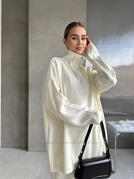 Трендові штани палаццо, висока талія із еластичною вставкою. Джемпер із широким Коміром із широкою горловиною застібається на металеву блискавку.