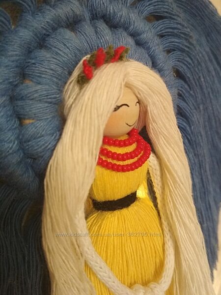 Для поціновувачів ручної роботи в українському стилі, пропоную янгола "Крила України". Янгол виконаний в техніці макраме з використанням бавовняних ниток, дерев´яних елементів, бісеру та акрилових фарб. Кожна деталь виготовлена з любов´ю. Чудовий подарунок на свято або, як сувенір ручної роботи, на згадку про Україну.Робота представлена в подарунковій упаковці.