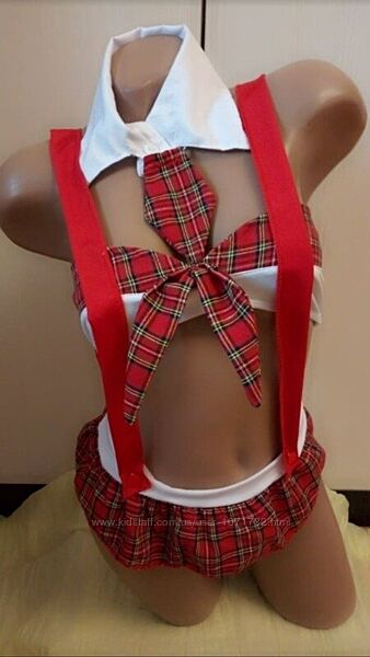 Оригінальний костюм Школярка. Виконаний у вигляді топа, спідниці на гумці та підтяжках, краватку. У такому вбранні ви виглядатимете дуже сексуально та інтригуюче.Пограйте зі своїм партнером!