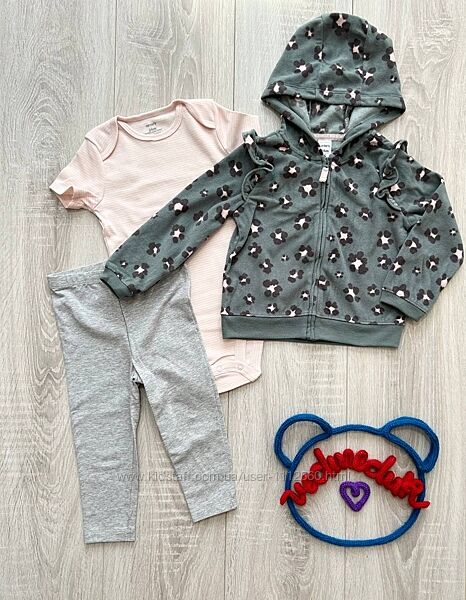 Костюм трійка для дівчат.Костюм складається з трьох речей: флісова кофточка на блискавці с капюшоном та двома карманами, боді з коротким рукавом, штани.