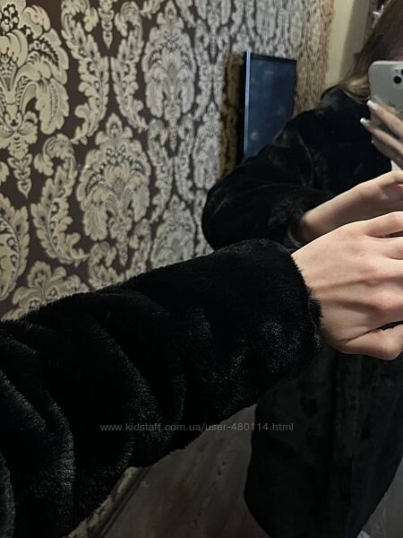 Шуба виготовлена зі штучного хутра під мутон, утеплена синтепоном, відкладний комір. Є дві врізні кишені, застібка кліпса.Розмір М, (L)