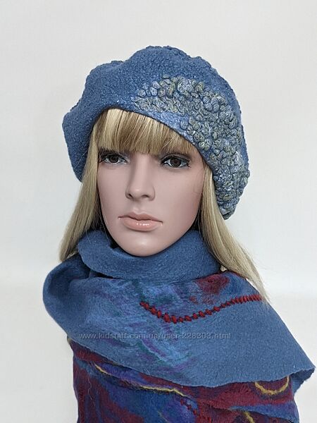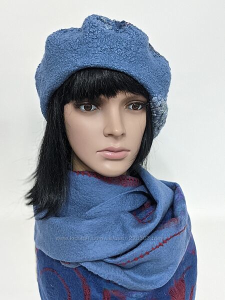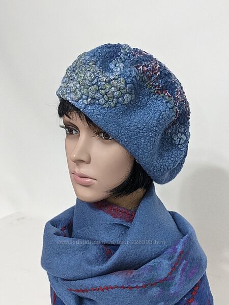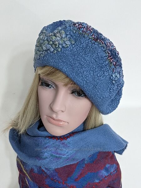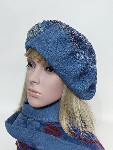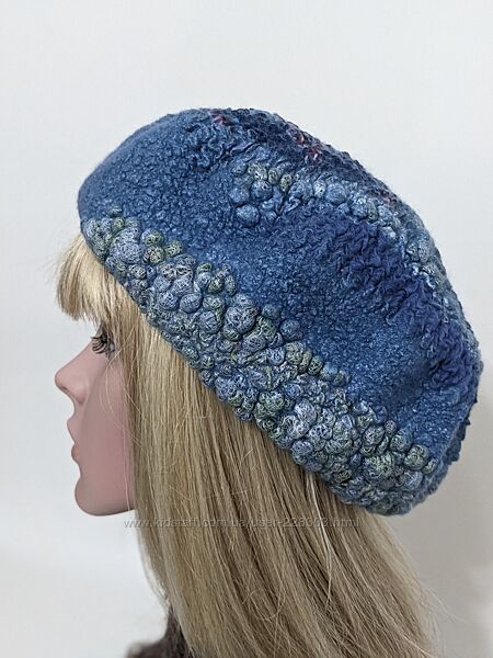 Берет ′Мрія′ зваляний вручну з овечої вовни 18 мкр (виробництво Італія), декорований шовковими і віскозними волокнами.