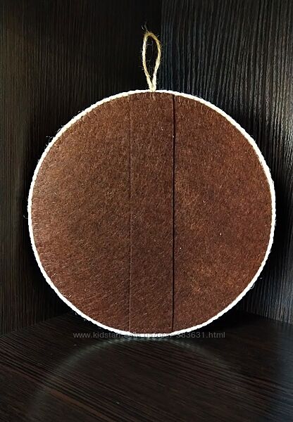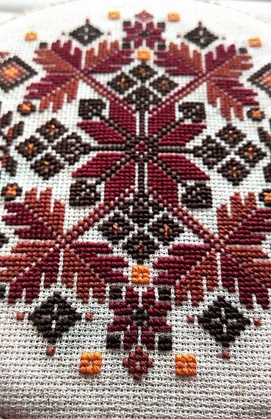 Вишивка-оберіг виконана на лляному полотні. В середині щільний матеріал, який міцно тримає каркас. Для сяйва окремих елементів вишивки додано бісер. Розмір в діаметрі --- 22 см.