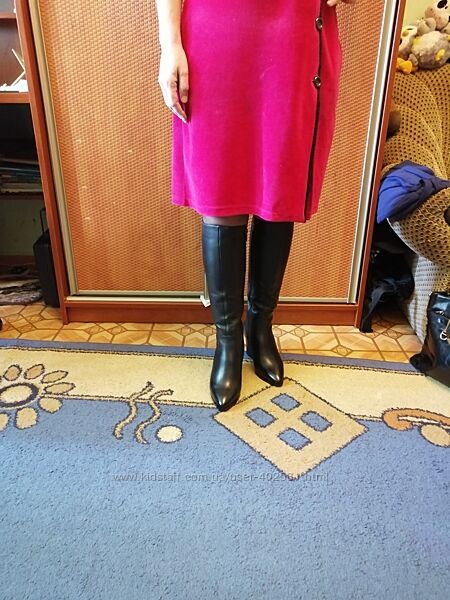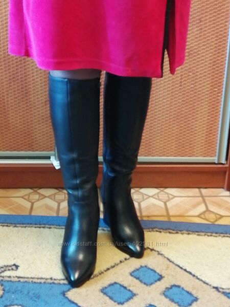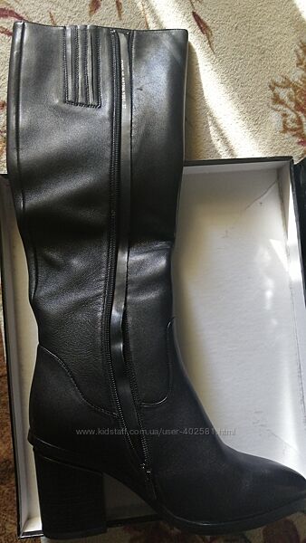 Чобітки високі нові, м´якесенька шкіра, натуральна. Єврозима. Хутро цегейка натуральна. Підбор 8см, стійкий. Загострені носки. Зручні, стійкі. Розмір 37 на ступню до 25 см включно. Резиночка на литочці. Висота до колін.Без повернень.