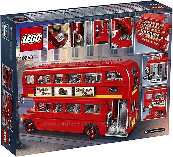 Серія LEGO Creator дає змогу експериментувати у світі, що навколо нас. За допомогою LEGO Creator можна побудувати величезну кількість реалістичних будинків і машин, які мають неповторний вигляд. У наборах є й машини, і літаки, і навіть суперкруті будинки на узбережжі — всі вони виготовлені в яскравих кольорах LEGO, які покликані привертати увагу на довгий час і розвивати яскраву уяву.Приготуй свою подорож у минуле з моделлю знаменитого двоповерхового лондонського автобуса LEGO Creator Expert. Хапайся за поручень і забирайся на відкритий задній майданчик, де встановлений ящик для використаних квитків і вогнегасник. Забирайся напівгвинтовими сходами на оглядовий майданчик, де є крісла та інші предмети, зокрема забута кимось парасолька, газета, порожня склянка й навіть стара жуйка, залишена під злегка пошарпаним сидінням. Тобі достатньо відчинити двері, щоб побачити кабіну водія з панорамним лобовим склом. Розглянути двигун можна піднявши капот, а якщо хочеш вивчити внутрішній простір, від´єднай дах і верхній майданчик. Вибирай епоху, яка тобі більше до вподоби, наклеюючи двосторонні постери, що зображують Лондон в 1950-ті роки або в наш час. Завдяки добре знайомому силуету яскраво-червоного корпусу, спеціально виготовленим гусеничним шинам і вказівникам маршруту ця ретельно продумана модель відрізняється унікальною елегантністю й у найдрібніших деталях передає характер і чарівність знаменитого символу Лондона!