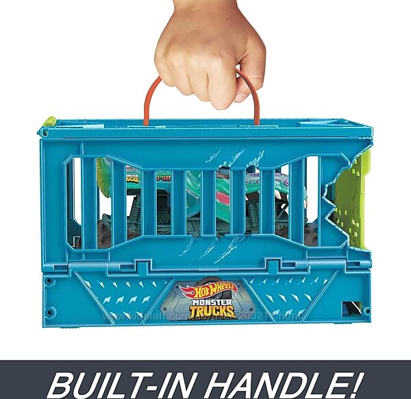 The Hot Wheels® Monster Trucks 1:24 Mega-Wrex™ Oversized Crash Cage™ великі аварії та розбиття у зручному контейнері, який можна брати будь-куди.