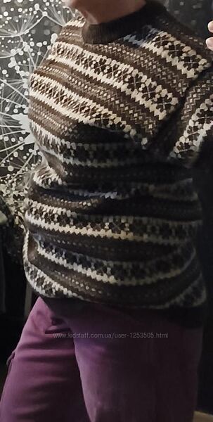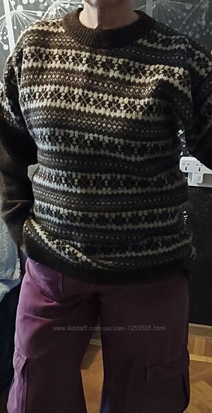 Данные свитера производятся общиной гражданского прихода в английском графстве Норфолк. Весь процесс, от разведения овец элитной породы до выпуска готовой продукции - плоды труда жителей прихода. Цены подобных свитеров от 200 до 500 фунтов!Шикарнейший , очень теплый и красивый свитер из 100% шерсти, с характерным джаккардовым узором, винтаж.