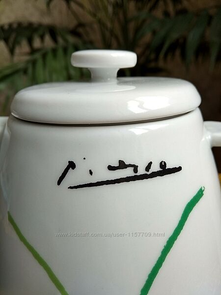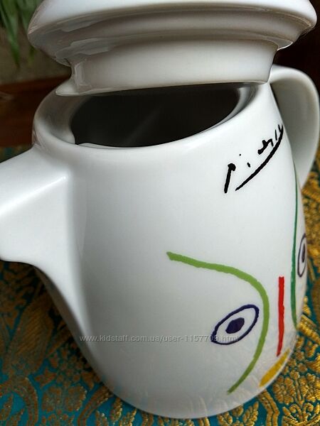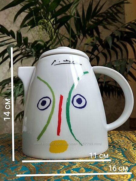 Рідкісний порцеляновий чайник Picasso. Не новоділ, не Китай . Оригінальний екземпляр, виготовлений фірмою Tognana, по офіційним ліцензіям картин Пабло Пікассо . Париж 2004 року. Дизайн колекції створено по мотивам робіт художника 60-их років. Чайник досить об´ємний , не заварник ! Об´єм приблизно 650 мл. Стан новий, в користуванні не був. Заміри на фото .