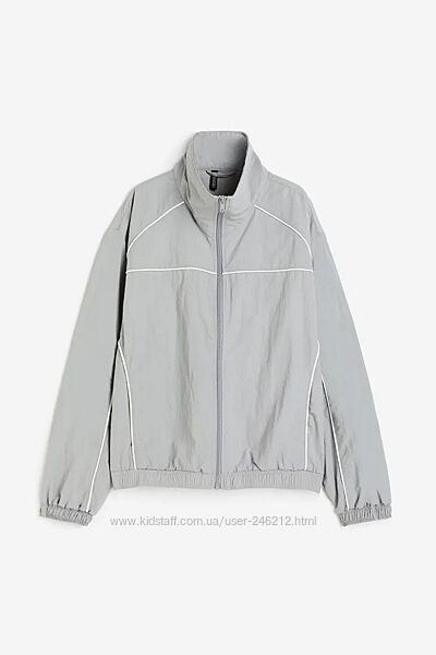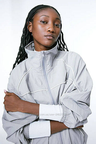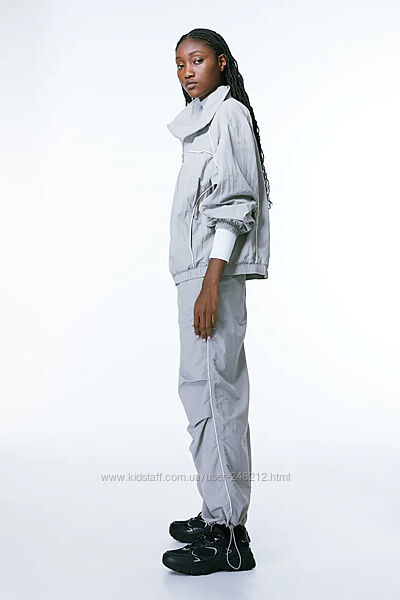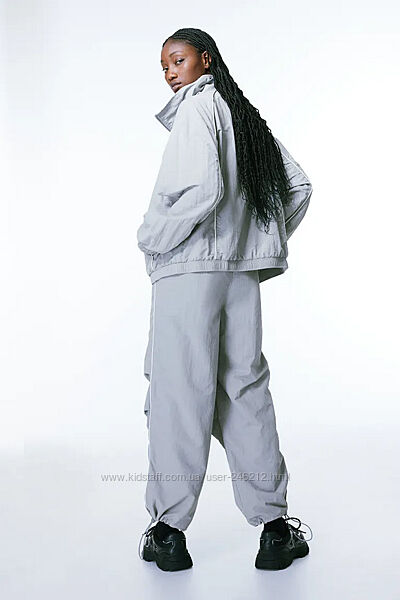 Стильний спортивний костюм H&M із останньої колекції!Нейлонова вітровка вільного крою з високим коміром, блискавкою спереду та заниженою лінією плечей. Непомітні кишені в бічних швах та потайна гумка на манжетах та по нижньому краю. Без підкладки.