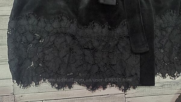 Жіночий велюровий халат на запах з кишенями та поясом у комплекті. Виріб чорного кольору з довгими рукавами, прикрашений мереживом. Тканина м´яка та приємна до тіла.р.S