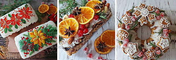 Выпечка рождественского кекса.Заливка поверхности кекса под роспись.Декор кексов с Пуансетиями в витражной технике.Декор кекса с Желтой пуансетией и объёмной зеленью.Декор кекса Расписными пряниками.Декор кекса Карамелизированными апельсинами.Приготовление айсинга.