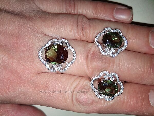 Новый красивый, изящный комплект (серьги и кольцо), серебро 925 пробы, покрытие - родий со шпинелью синтетической и фианитами. Совершенно новый, вообще не носился.Камень зеленый с серыми нотками.