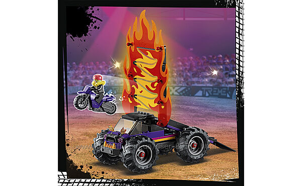 До цього крутого ігрового набору LEGO City «Подвійна петля каскадерської арени» (60339) входить 2 каскадерських мотоцикла з маховиком та вантажівка-монстр зі стартовим трампліном для карколомних трюків. Реквізит арени включає іграшкову стіну з полум´я, зміїну петлю, що замикається, вогняну петлю, а також безліч цікавих аксесуарів. Просто додай 7 мініфігурок, серед яких 2 трюкових мотоцикли, та влаштовуй видовищні шоу і змагання.Вік: 7+