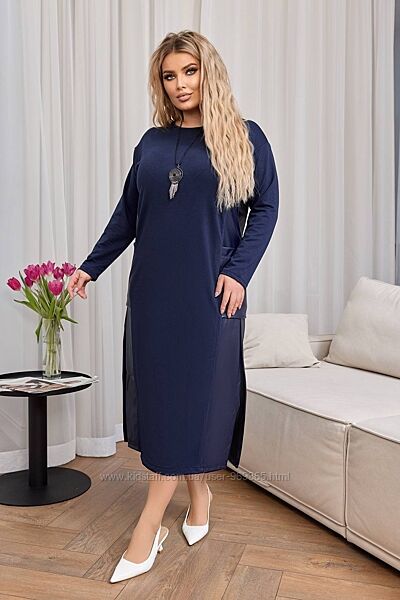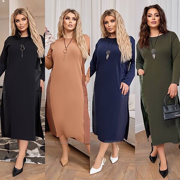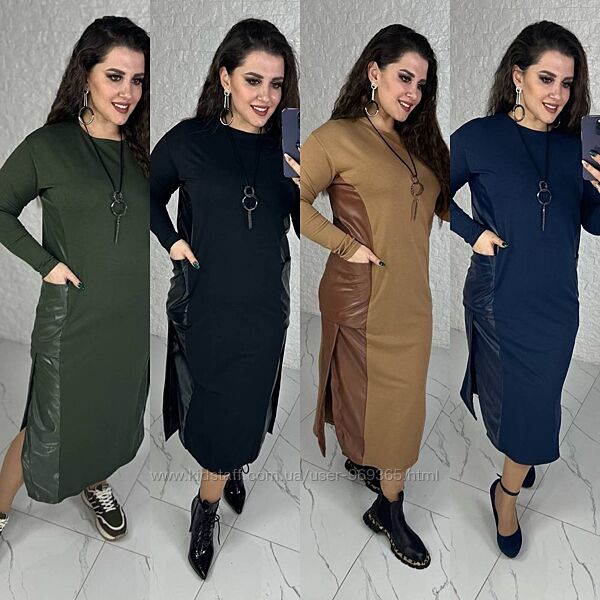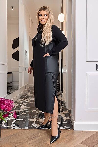 Подробное описание: Плаття з прикрасою, двонитка із вставками з еко-шкіри. Розміри вiд 46 до 64