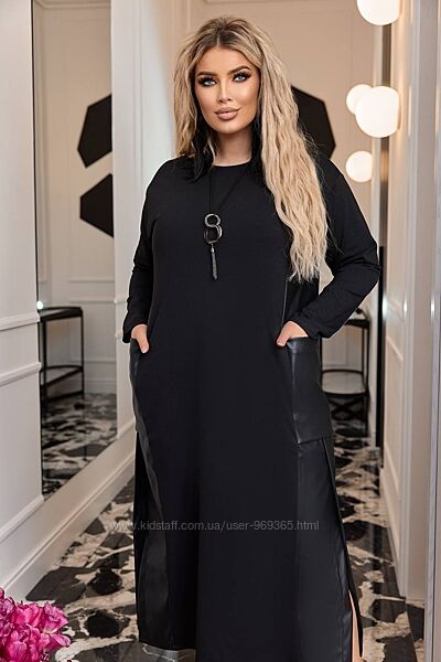 Вільне плаття, з боків шкіряні вставки з розрізами+кишені, довгий рукав, прикраса в комплекті(може відрізнятися від фото та відео)