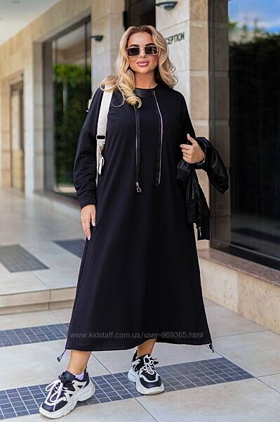 ПЛАТТЯ вільне, з боків по низу фіксується резинкою на фіксаторі(можна зробити меншою довжину плаття, якщо затягнути з боків); на грудях дві робочі молнії, до них пристібаються молнії на куртці; з боків кишені.