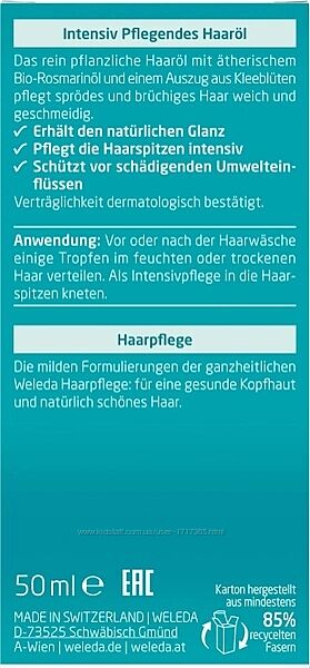 Масло для волос Weleda с розмарином и пипеткав подарок , 50 мл